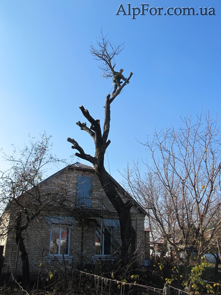 Наш великий досвід та висока кваліфікація допомогли за кілька годин «перетворити» цю стару грушу в купу дров та трохи гілок, не пошкоджуючи розташовані біля дерева будови і рослини.